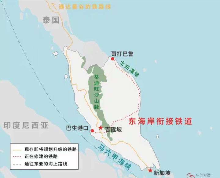 马来西亚政府正在和泰国商议东海岸铁路向北延伸到泰国边境兰斗班让的方案,这不单单是马来西亚内部铁路网络与泰国现有轨道初次实现物理连接,也为整个中南半岛铁路的互相连接打下了根基。